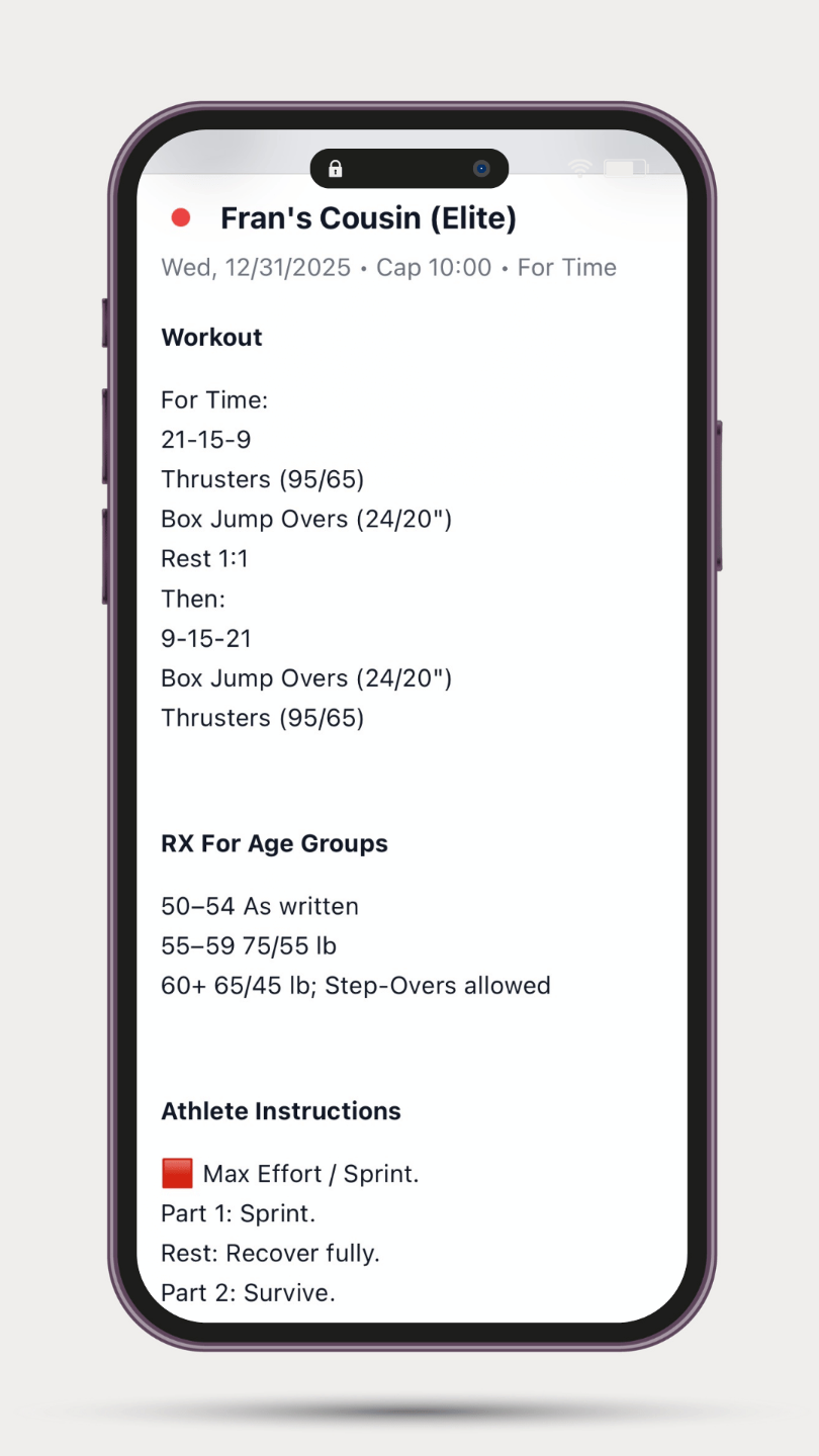 Access to all tracks (Elite, Compete, Core, Scaled, Minimal Equipment, Body Building, Capacity/2nd Session). Switch anytime.
